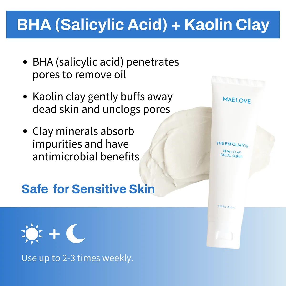 Safe for sensitive skin types, our microbead-free facial scrub is powered by salicylic acid (BHA), pulverized kaolin clay, and diatomaceous earth. Together, these ingredients gently draw out impurities, absorb excess sebum, and unclog pores.